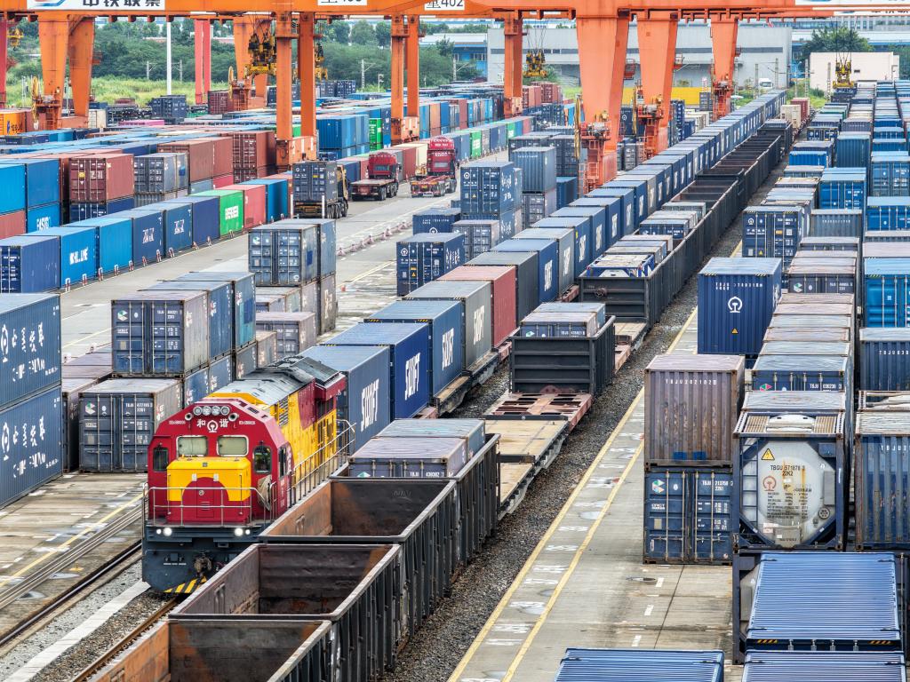 2025年9月8日,滿載“重慶造”汽車的中歐班列(成渝)在重慶團結(jié)村中心站等待發(fā)車(無人機照片)。 新華社記者 唐奕 攝