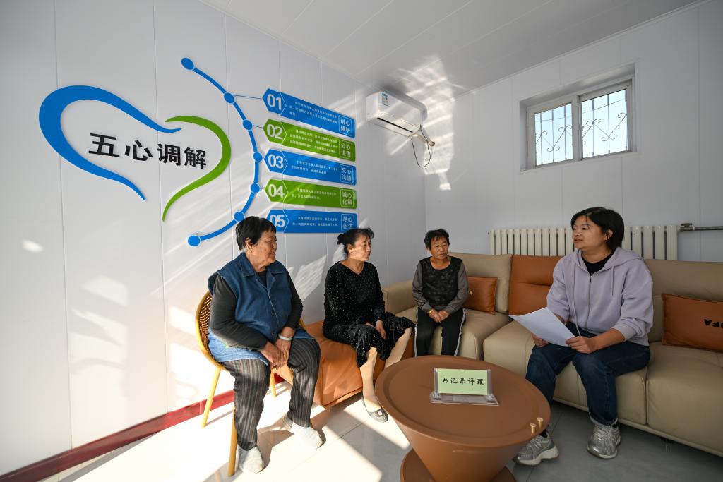 在天津市寧河區(qū)蘆臺街道金華路社區(qū),社區(qū)黨總支副書記吳蕊(右一)就社區(qū)監(jiān)控設(shè)備安裝問題為社區(qū)居民進行解答(2024年10月11日攝)。金華路社區(qū)積極踐行新時代“楓橋經(jīng)驗”,將原社區(qū)居委會閑置用地提升改造成為聯(lián)絡(luò)群眾的基層綜合治理陣地——“解鈴小院”。 新華社記者 孫凡越 攝