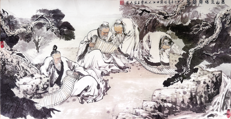 四皓——東園公唐秉、夏黃公崔廣、綺里季吳實(shí)、甪里先生周術(shù),為避秦時(shí)焚書坑儒之禍,隱入商山,采芝棲巖,以清貧之身守士人之節(jié)。他們?cè)鴲u于劉邦輕侮士人,拒其征召,卻在太子劉盈危難之際,毅然出山,以皓首巍冠之姿鎮(zhèn)服高祖,穩(wěn)漢室于既傾。事成后,四皓拒封歸隱,飄然復(fù)返山林。