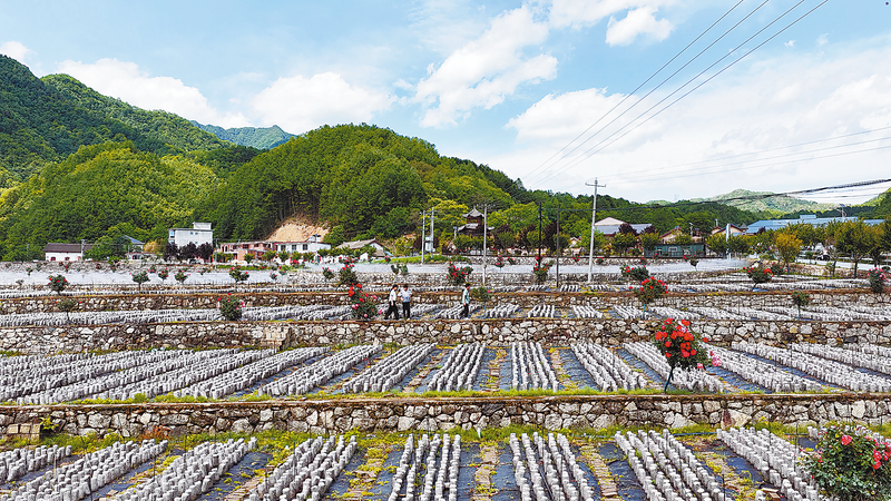 △9月6日,柞水縣下梁鎮(zhèn)老庵寺村木耳種植基地與藍(lán)天白云相映成趣,一排排菌棒整齊排列,勾勒出一幅生機(jī)盎然的田園畫卷。