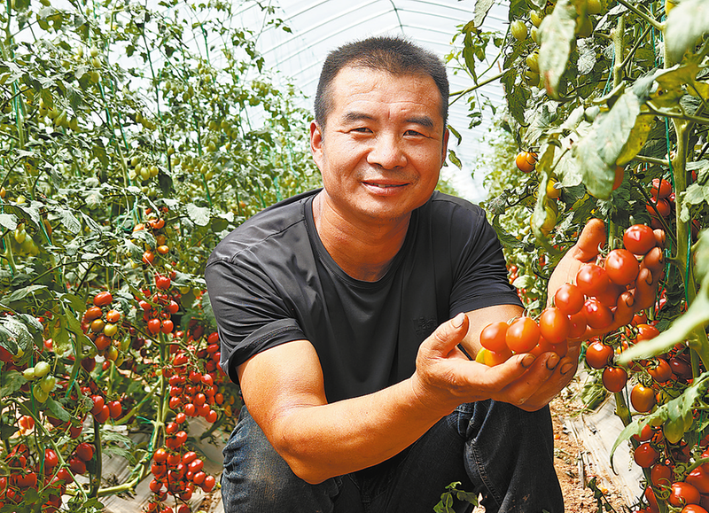 △9月16日,洛南縣四皓街道連河村瓜果種植采摘基地內(nèi),圣女果藤蔓上綴滿了果實,技術(shù)員羅鵬在查看圣女果長勢。