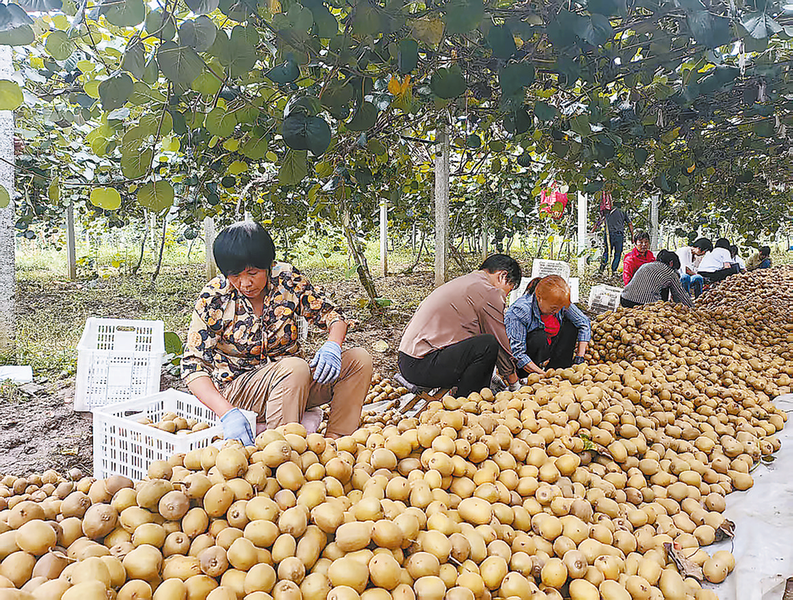 △日前,商南縣富水鎮(zhèn)的獼猴桃迎來采摘期。圖為9月17日,王家莊村的種植基地內(nèi),村民正在分揀獼猴桃。