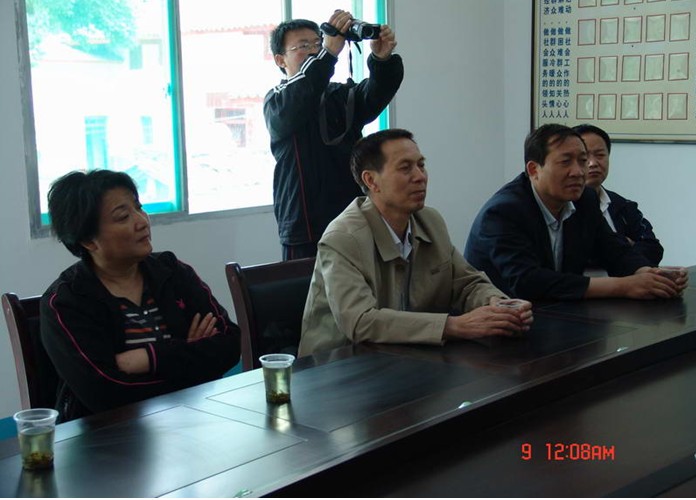 市環(huán)保局黨組書記、局長翁同德(左二)、黨組成員、副局長袁 娜(左一)、黨組成員、紀檢組長閆緒民聽取東川鎮(zhèn)黨委和鄭家莊村委會匯報全村經(jīng)濟社會發(fā)展情況。