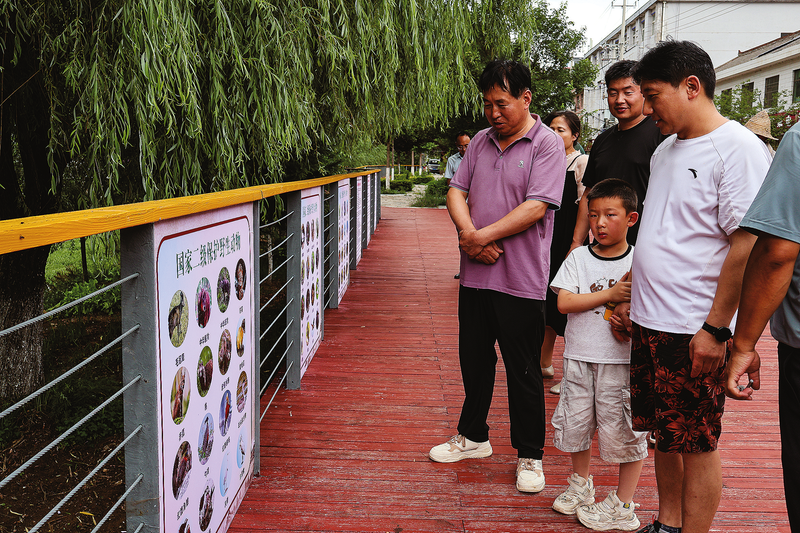 石坡鎮(zhèn)集鎮(zhèn)沿河步道的鳥類及野生動物科普長廊,吸引周邊群眾駐足觀看。