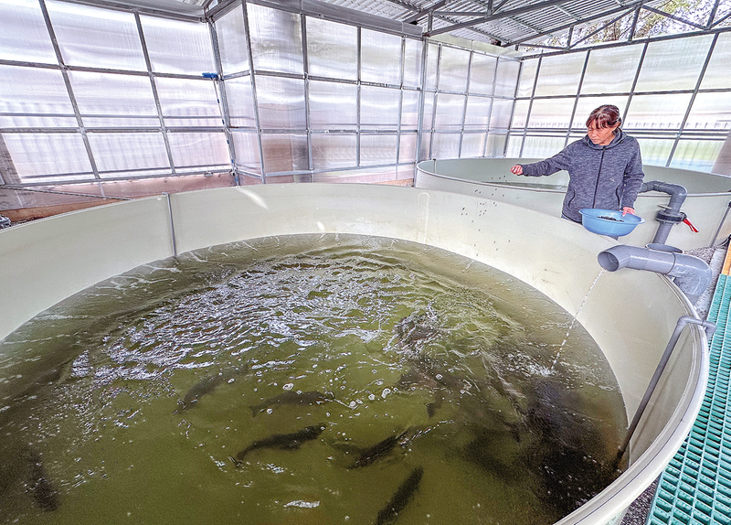 走出民宿區(qū),順著村路往前走,很快就能看到七星村的特色產業(yè)——七星村家庭版冷水魚養(yǎng)殖示范項目。封閉式的大棚內,安置著4個直徑5米的圓形養(yǎng)魚池,分別養(yǎng)著虹鱒和鱘魚兩種冷水魚。60歲的技術人員劉巧利正在給魚喂食:“我每天來給魚喂食、消毒等。基本上這里的魚都是供給村里的農家樂了。”
